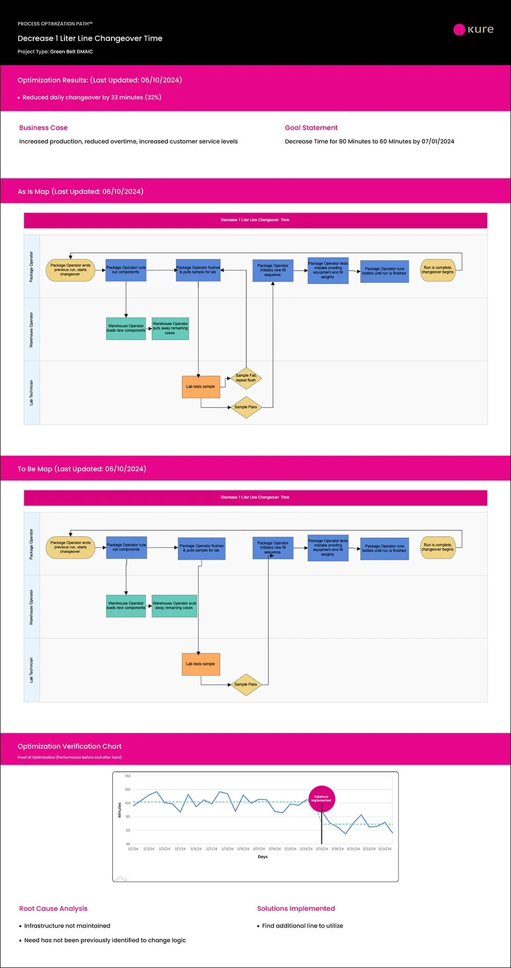The implementation of these solutions led to a significant reduction in line changeover times. The team reduced the changeover time from 102 to 69 minutes, a 32% improvement, exceeding the initial goal. This project highlights the importance of a structured approach to problem-solving using Kure Process Improvement Software, which often leads to surprisingly simple but impactful solutions. For the company, this success sets a benchmark for future projects and reinforces its commitment to continuous improvement and operational excellence.